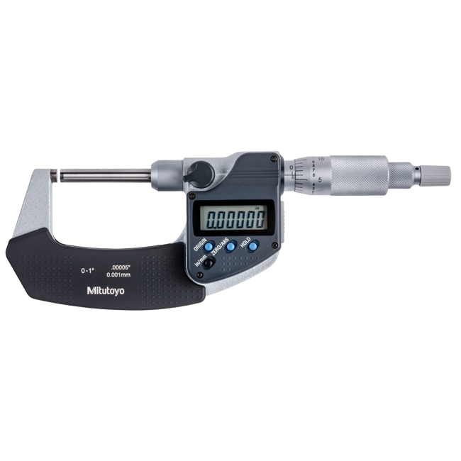 The Mitutoyo Digimatic digital micrometer with non-rotating spindle reduces torsion on softer parts being measured and prevents workpiece deformation and wear. A ratchet-stop mechanism provides uniform pressure on a workpiece for precise, repeatable measurements. Measurements are displayed on a coolant-proof, easy-to-read LCD readout.