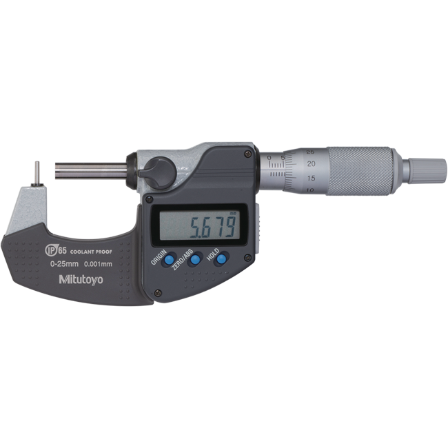 The Mitutoyo Digimatic coolant-proof tube micrometer measures the thickness of tube walls within +/- 0.00015” of accuracy. This micrometer has an IP65 dust and water protection level.